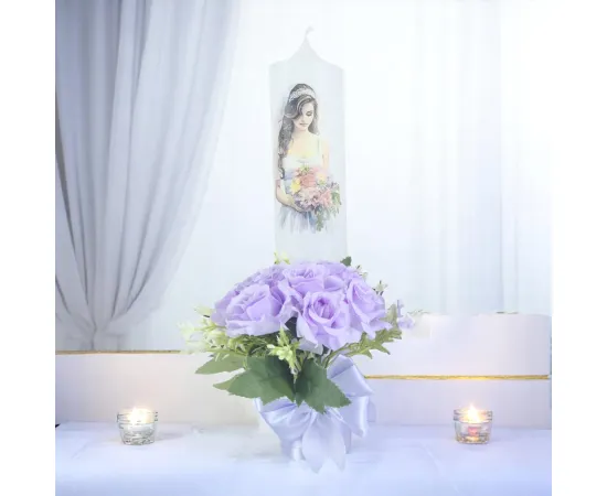 Fiecare lumânare din set este meticulos decorată cu flori delicate și o fundiță subtilă, aducând o notă de frumusețe și rafinament. Florile pot fi realizate din diverse materiale, cum ar fi țesături, mătase artificială sau alte materiale textile, iar fundița adaugă o atingere de eleganță și feminitate.