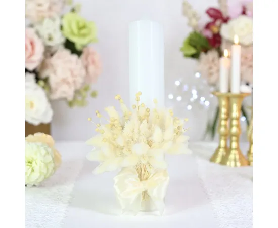 Setul de lumânări de cununie cu flori și fundiță este nu doar o amintire frumoasă a momentului special al căsătoriei, ci și o expresie vizuală a dragostei și devotamentului dintre parteneri.