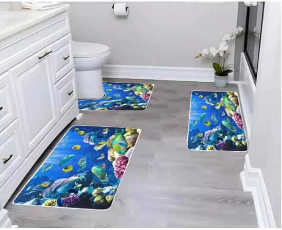 Pachetul de livrare include 1 covoras pentru baie, 1 covoras pentru suportul de la chiuveta, 1 covoras pentru wc.
