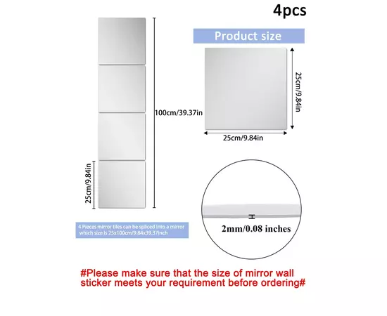 Set 4 Oglinzi Deorative Audoadezive, Forma Patrat, 25x100 cm