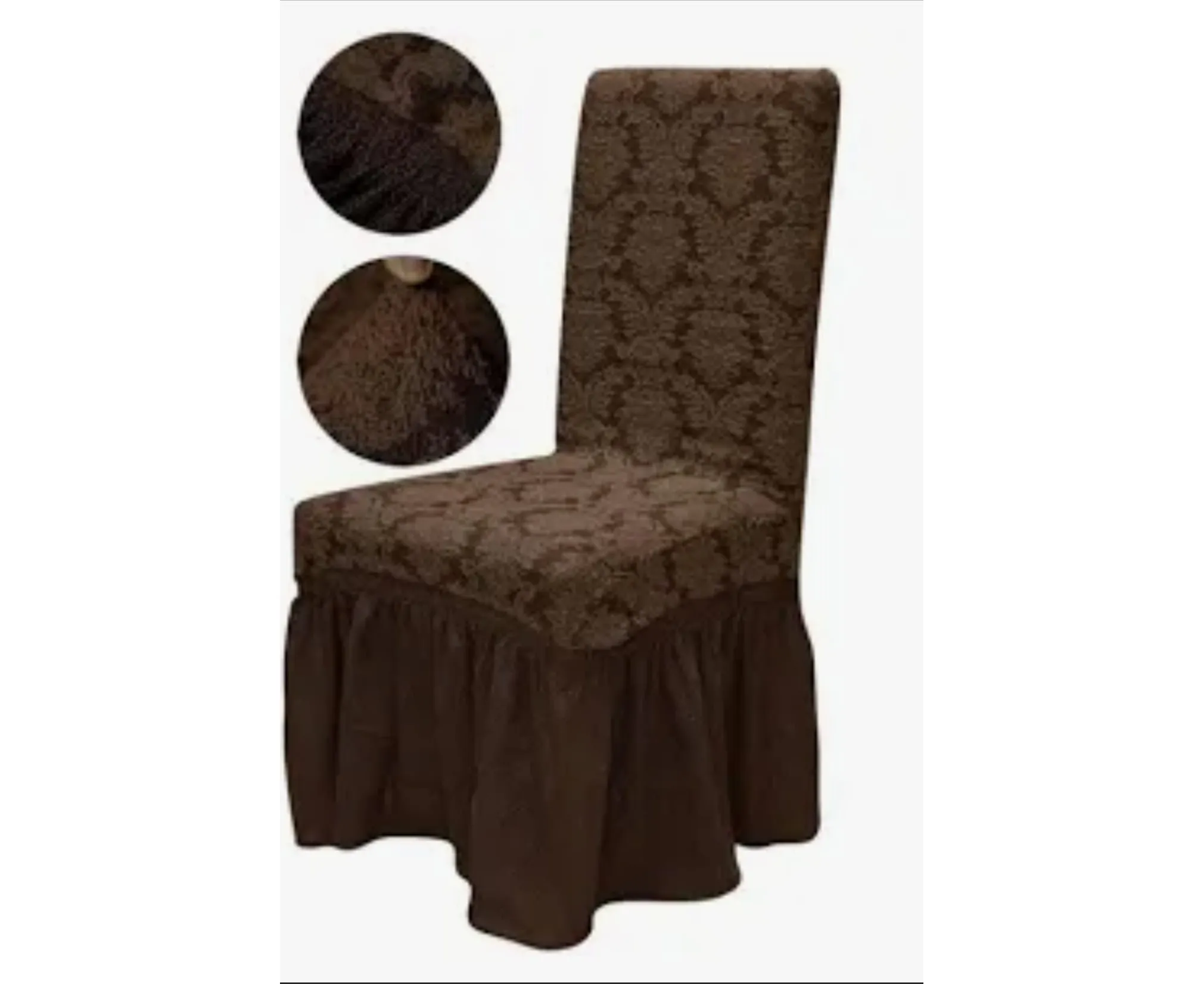 Setul conține 6 huse pentru scaune, realizate din material jacquard de calitate superioară, cu un design rafinat. Textura ușor elastică și modelul ornamental oferă un aspect elegant și se potrivesc perfect atât în dining, cât și în living sau pentru evenimente speciale.
