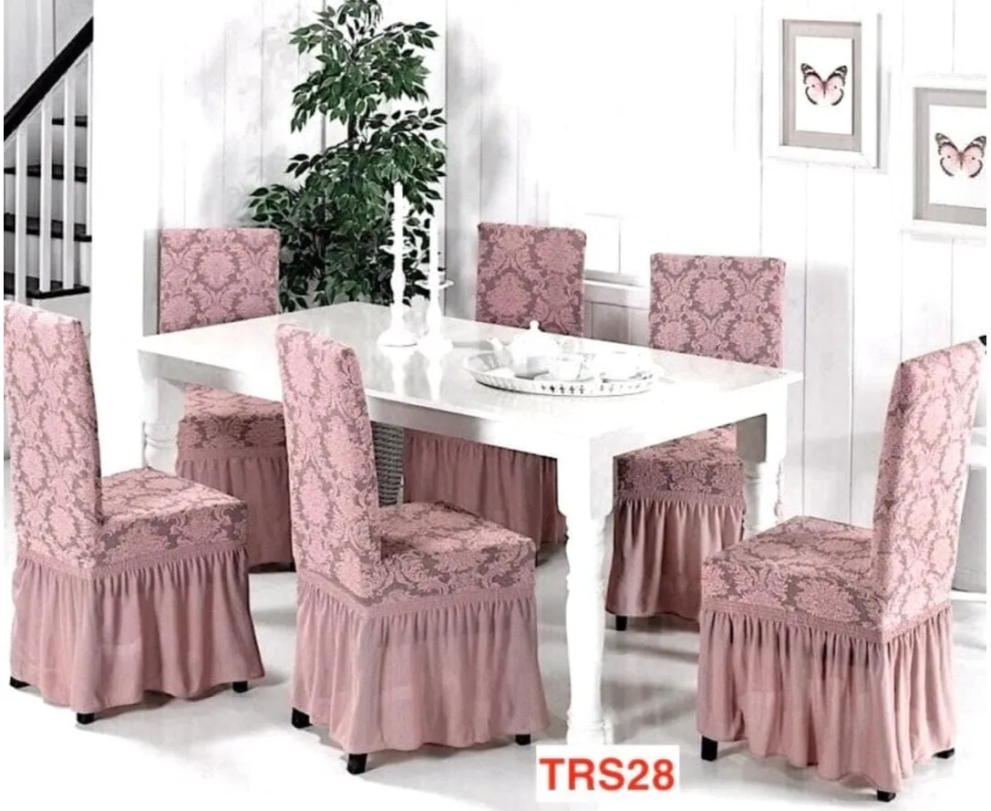 Setul conține 6 huse pentru scaune, realizate din material jacquard de calitate superioară, cu un design rafinat. Textura ușor elastică și modelul ornamental oferă un aspect elegant și se potrivesc perfect atât în dining, cât și în living sau pentru evenimente speciale.