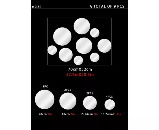 Set 9 Oglinzi Deorative Audoadezive, Formă Circulară, Diametru 10, 15, 18 si 20 cm