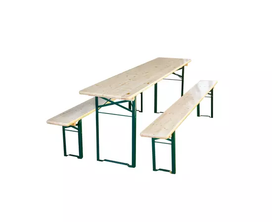 Setul Standard contine doua bancute si o masa, toate avand cadrul din metal, iar blatul si sezutul sunt fabricate din lemn de molid lacuit.