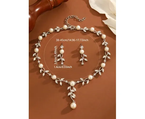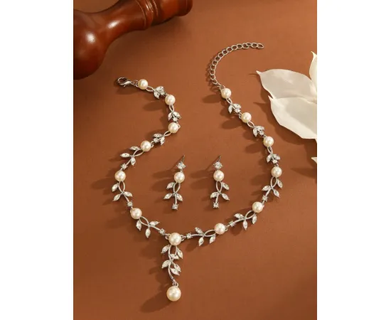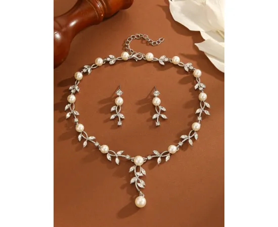 Adaugă o notă de rafinament natural ținutei tale cu acest set de bijuterii elegant format din 3 piese: un colier și o pereche de cercei cu design delicat în formă de frunze cu cristale strălucitoare.