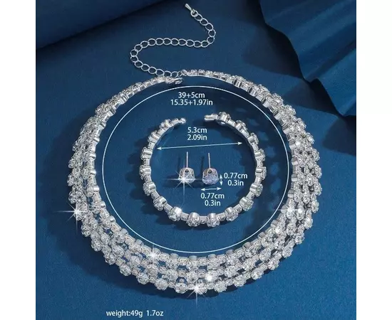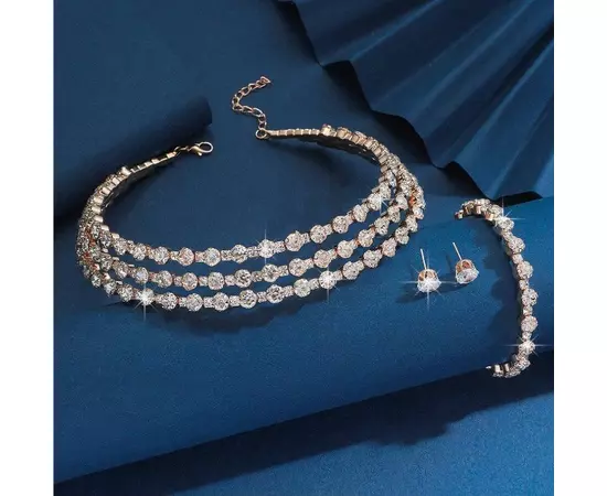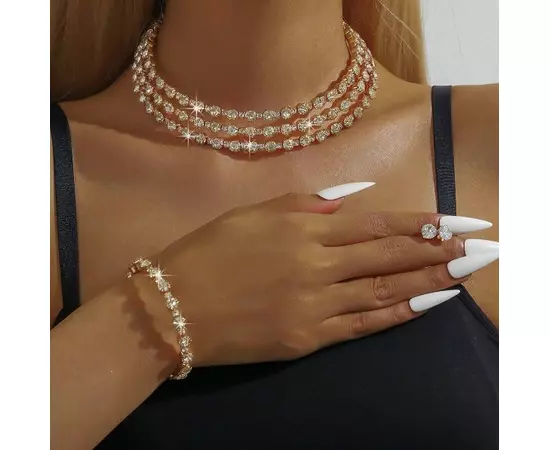 Acest colier auriu este piesa centrală a setului, emanând eleganță și stil. Designul său rafinat este împodobit cu strasuri strălucitoare care captează lumina din toate unghiurile, oferindu-i un aspect strălucitor. Colierul se așază perfect la baza gâtului, adăugând un plus de glamour ținutelor de seară.