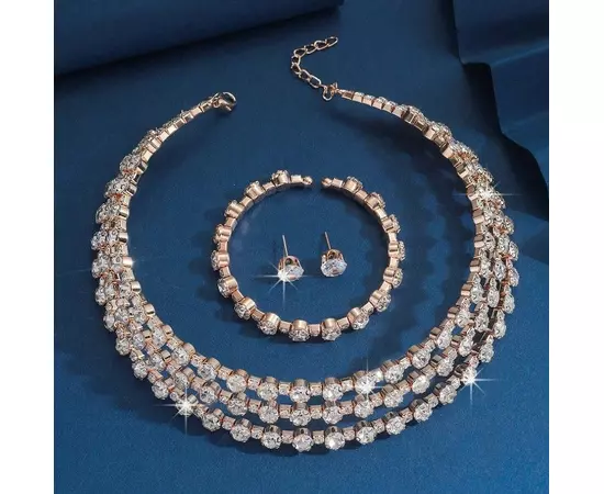 Descoperă eleganța și rafinamentul cu acest set de bijuterii cu strasuri în nuanțe aurii, perfect pentru orice ocazie specială. Setul include patru piese fabuloase care se completează reciproc: un colier sofisticat, cercei strălucitori și o brățară elegantă, toate împodobite cu strasuri de înaltă calitate pentru un plus de strălucire.