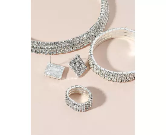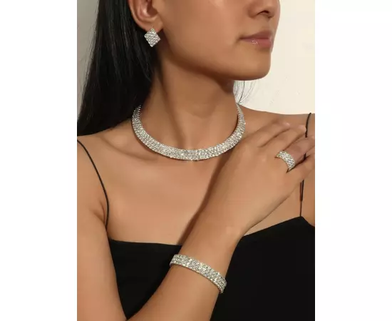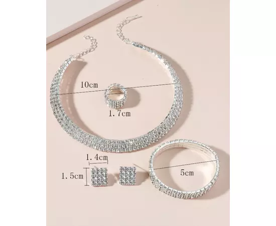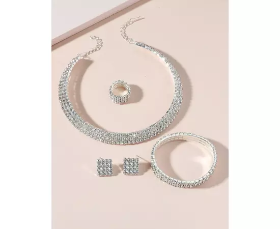 Set Bijuterii Cu Strasuri 5 Piese, Colier, Bratara, Cercei Si Inel, Argintiu - 077780