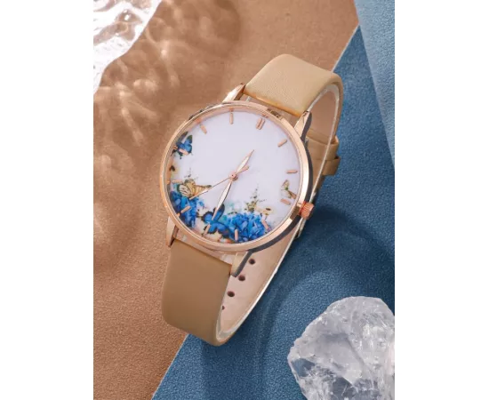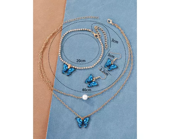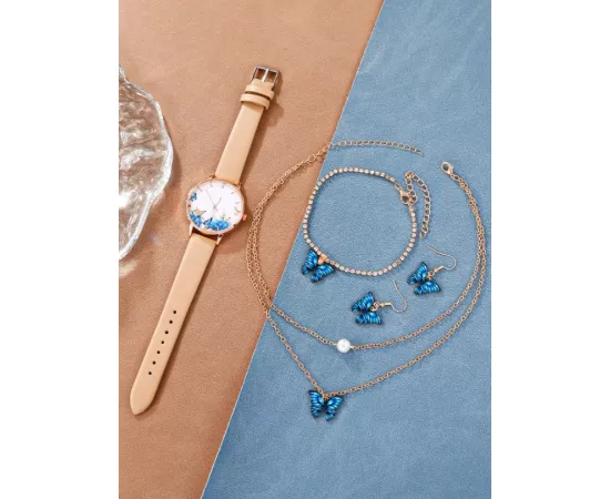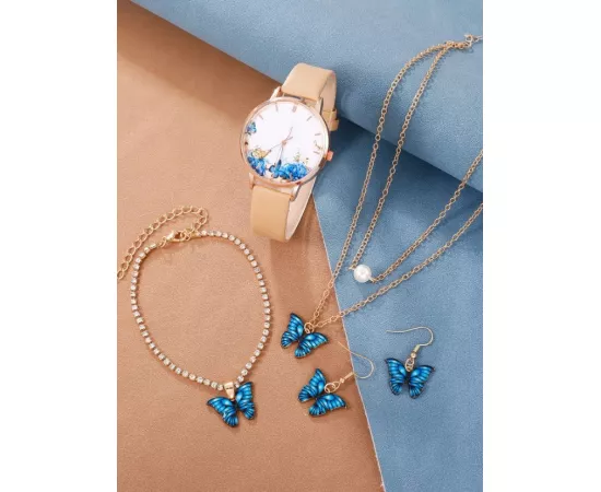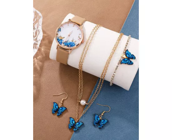 Set Ceas si Bijuterii, 5 piese, Model Fluturas - Bej, Auriu si Albastru