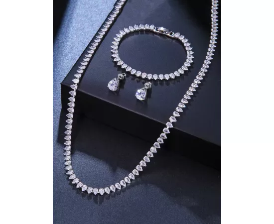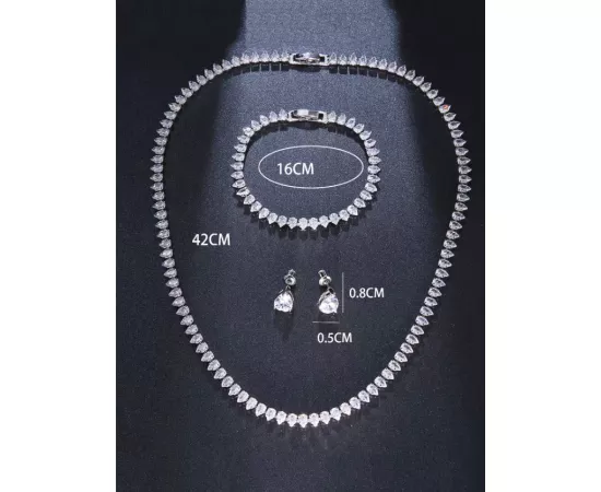 Acest set de colier, brățară și cercei din zirconiu cu strasuri, argintiu, este o alegere ideală pentru cei care doresc să adauge un strop de eleganță și strălucire ținutelor lor, fiind totodată un cadou minunat pentru ocazii speciale.