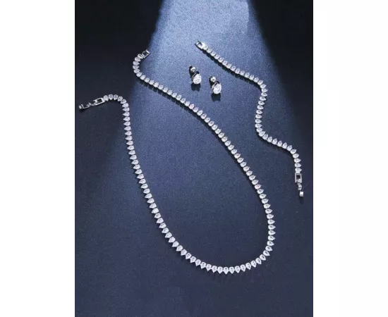 Setul de colier, brățară și cercei din zirconiu cu strasuri, de culoare argintie, este o alegere elegantă și rafinată pentru orice ocazie specială. Iată o descriere detaliată a acestui set: