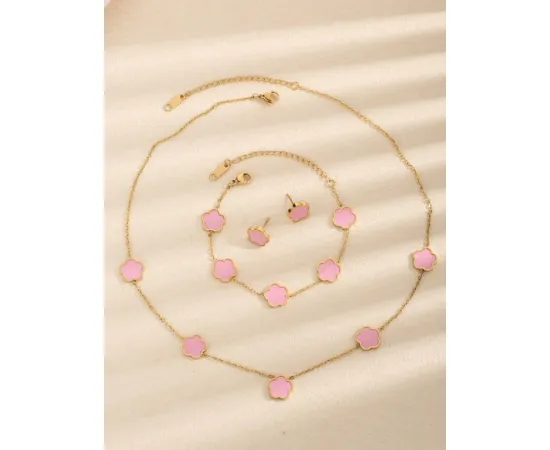 Adaugă un plus de rafinament oricărei ținute cu acest set elegant de bijuterii, format din 4 cercei delicati, o brățară fină și un colier sofisticat, toate realizate din oțel inoxidabil durabil și decorate cu petale de sidef pentru un efect strălucitor și natural.