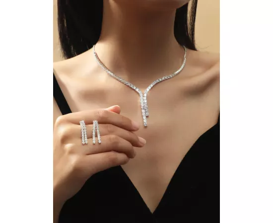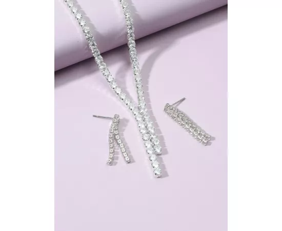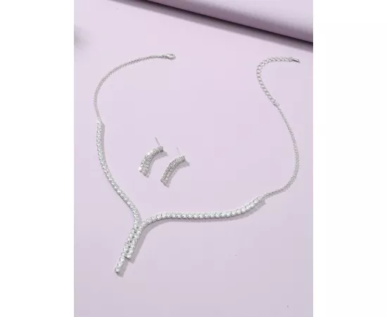 Setul de colier și cercei cu strasuri din zirconiu, de culoare argintie, este o alegere perfectă pentru a adăuga un strop de eleganță și strălucire oricărei ținute. Iată o descriere detaliată a acestui set: