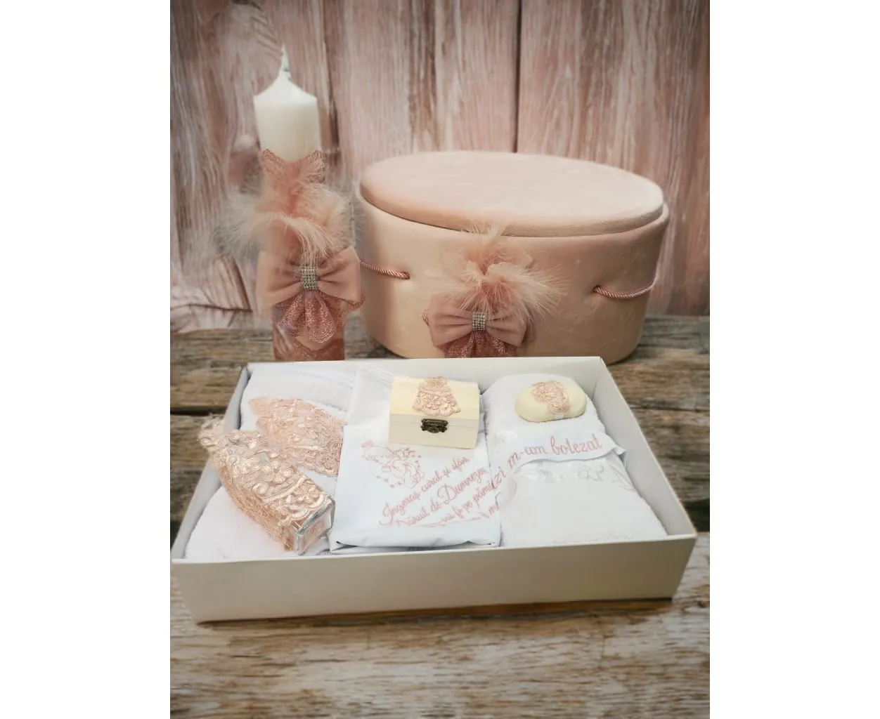 Deoarece botezul este un eveniment important pentru parinti si nasi, venim in ajutor cu un set care contine toate cele necesare pentru crestinarea bebelusului
