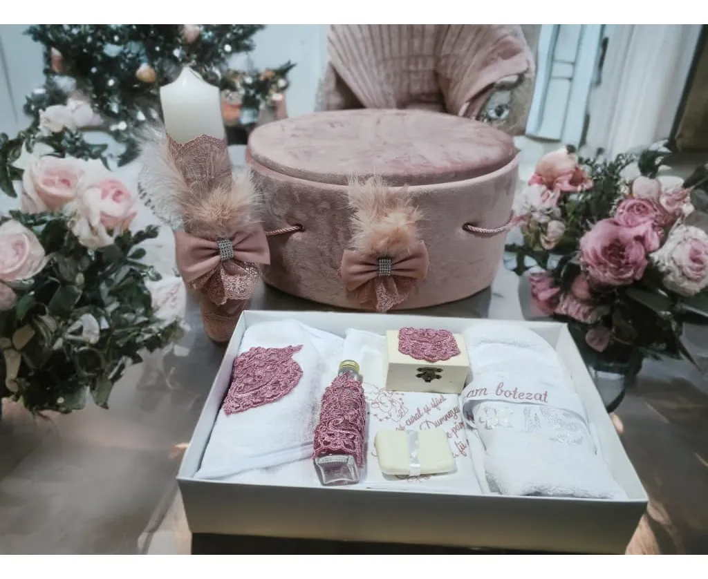 Deoarece botezul este un eveniment important pentru parinti si nasi, venim in ajutor cu un set care contine toate cele necesare pentru crestinarea bebelusului