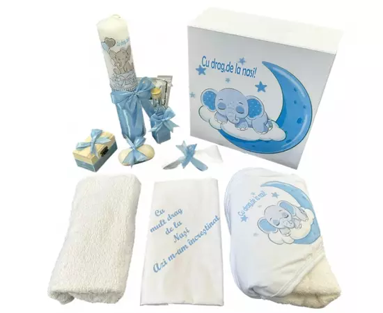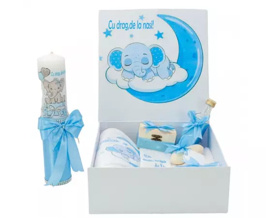 Set Cutie Trusou cu Lumanare, 9 Piese "Cu drag de la nasi" - Luna Elefant, Bleu - TB203