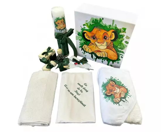 - Prosop pentru bebelus – din material moale deosebit de absorbant,din bumbac de cea mai buna calitate. Prosopul este decorat cu dantela si cu diferite mesaje. Dimensiunea prosopului este de 80 cm x 80 cm, suficient pentru a sterge bebelusul si pentru a-l tine infasurat pe parcursul ceremoniei.
