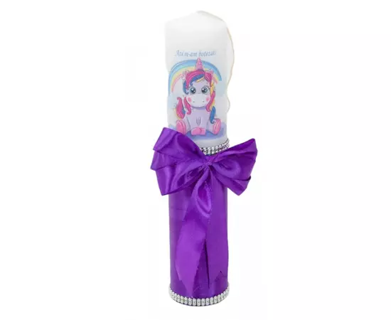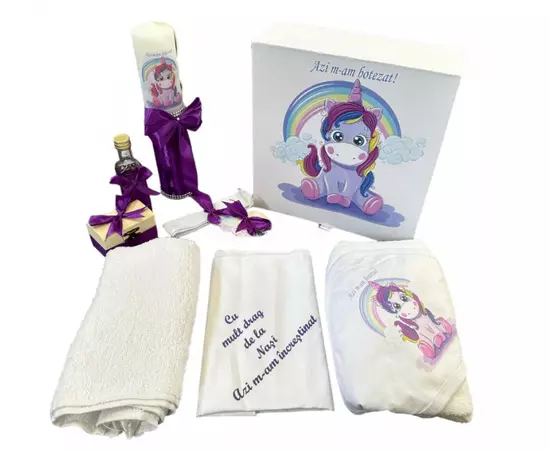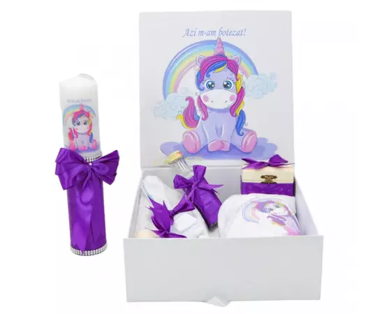 Set Cutie Trusou cu Lumanare, 9 Piese "Cu drag de la nasi" - Unicorn, Mov - TB198