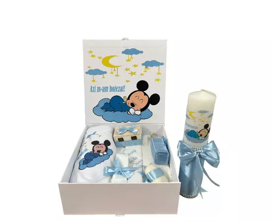 Set Cutie Trusou cu Lumanare, 9 Piese "Cu drag de la nasi" - Baby Mickey, Bleu - TB227