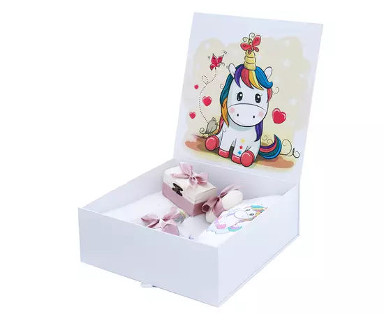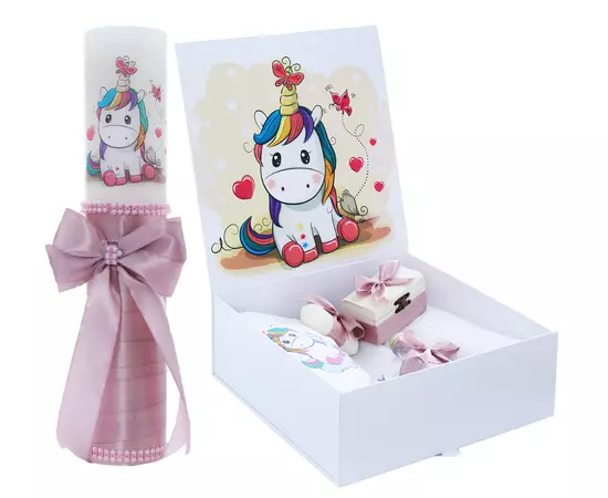 Set Cutie Trusou cu Lumanare, 9 Piese, "Cu drag de la nasi", Roz Pudra, Unicorn - TB188