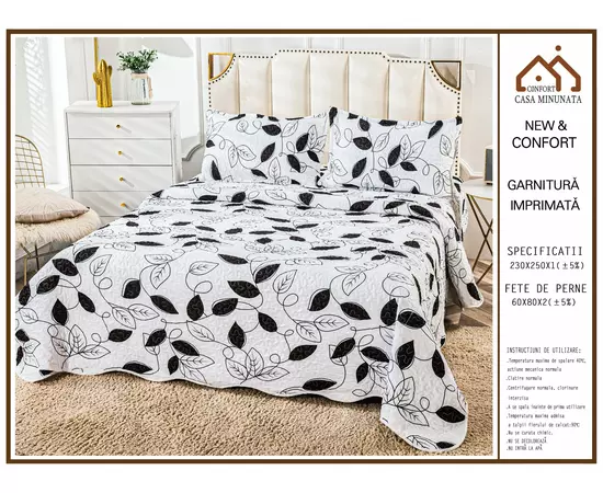 Cuvertura de pat matlasata, confectionata din bumbac tip tesatura finet.Imprimeul acestui set (cuvertura pat plus fete de perna) este realizat cu cele mai noi tehnologii - garantat nu se decoloreaza daca se respecta instructiunile de intretinere.