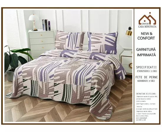 Cuvertura de pat matlasata, confectionata din bumbac tip tesatura finet.Imprimeul acestui set (cuvertura pat plus fete de perna) este realizat cu cele mai noi tehnologii - garantat nu se decoloreaza daca se respecta instructiunile de intretinere.