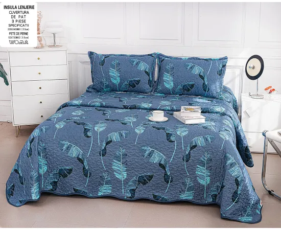 Cuvertura de pat matlasata, confectionata din bumbac tip tesatura finet.Imprimeul acestui set (cuvertura pat plus fete de perna) este realizat cu cele mai noi tehnologii - garantat nu se decoloreaza daca se respecta instructiunile de intretinere.