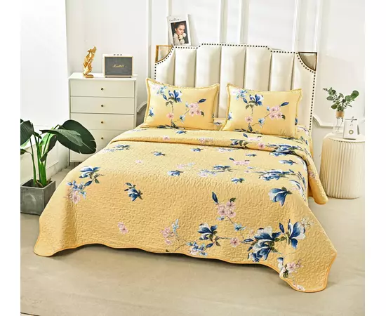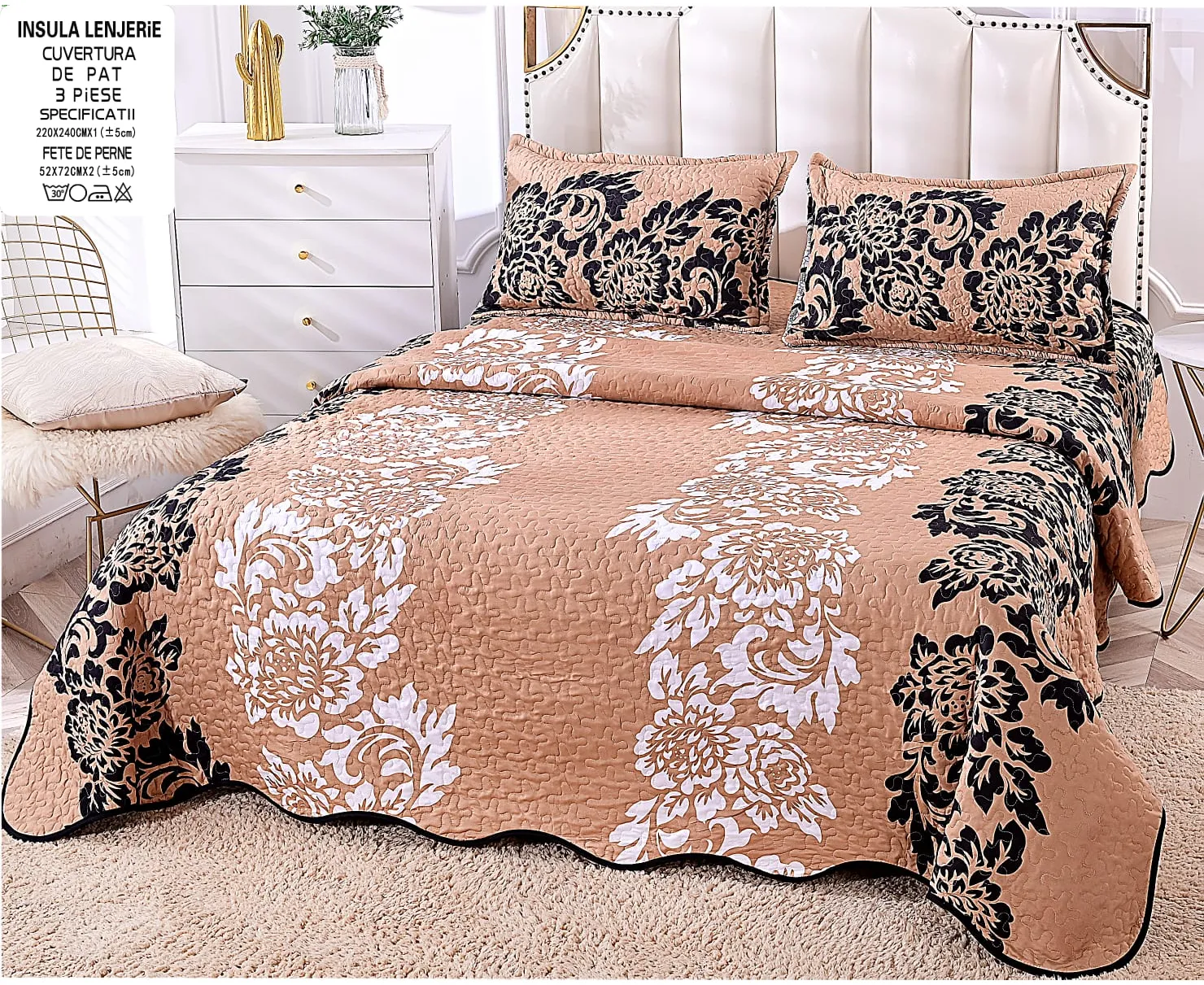 Cuvertura de pat matlasata, confectionata din bumbac tip tesatura finet.Imprimeul acestui set (cuvertura pat plus fete de perna) este realizat cu cele mai noi tehnologii - garantat nu se decoloreaza daca se respecta instructiunile de intretinere.