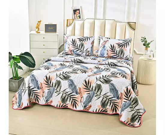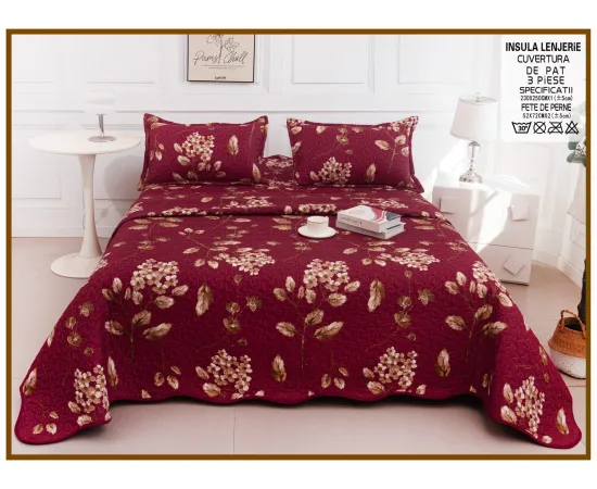 Cuvertura de pat matlasata, confectionata din bumbac tip tesatura finet.Imprimeul acestui set (cuvertura pat plus fete de perna) este realizat cu cele mai noi tehnologii - garantat nu se decoloreaza daca se respecta instructiunile de intretinere.