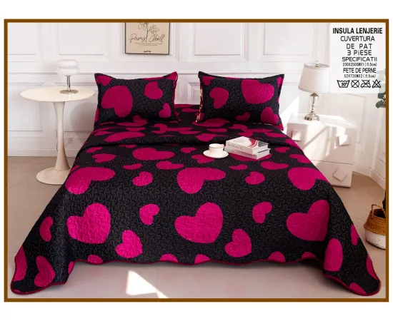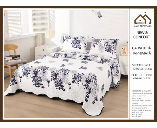 Cuvertura de pat matlasata, confectionata din bumbac tip tesatura finet.Imprimeul acestui set (cuvertura pat plus fete de perna) este realizat cu cele mai noi tehnologii - garantat nu se decoloreaza daca se respecta instructiunile de intretinere.
