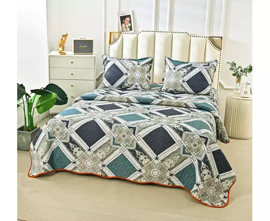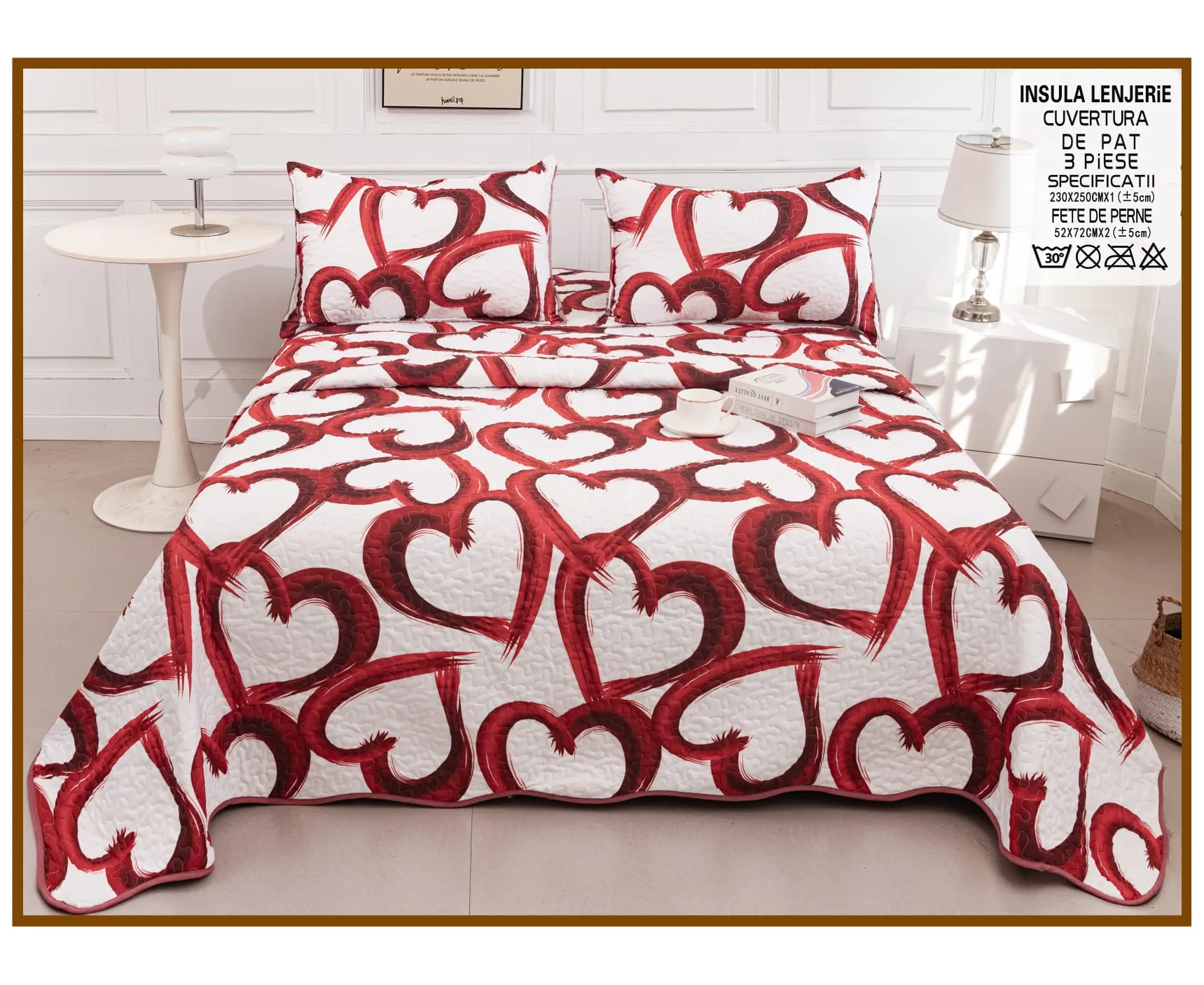 Cuvertura de pat matlasata, confectionata din bumbac tip tesatura finet.Imprimeul acestui set (cuvertura pat plus fete de perna) este realizat cu cele mai noi tehnologii - garantat nu se decoloreaza daca se respecta instructiunile de intretinere.