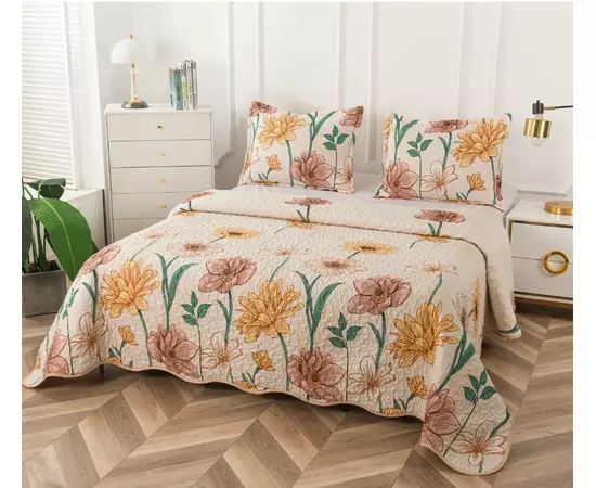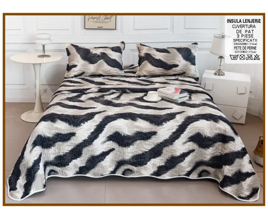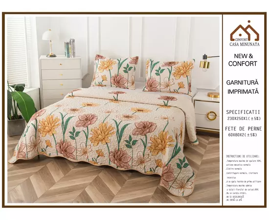 Cuvertura de pat matlasata, confectionata din bumbac tip tesatura finet.Imprimeul acestui set (cuvertura pat plus fete de perna) este realizat cu cele mai noi tehnologii - garantat nu se decoloreaza daca se respecta instructiunile de intretinere.