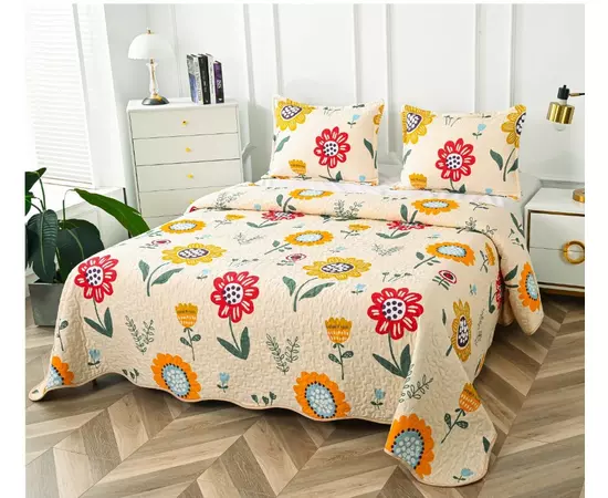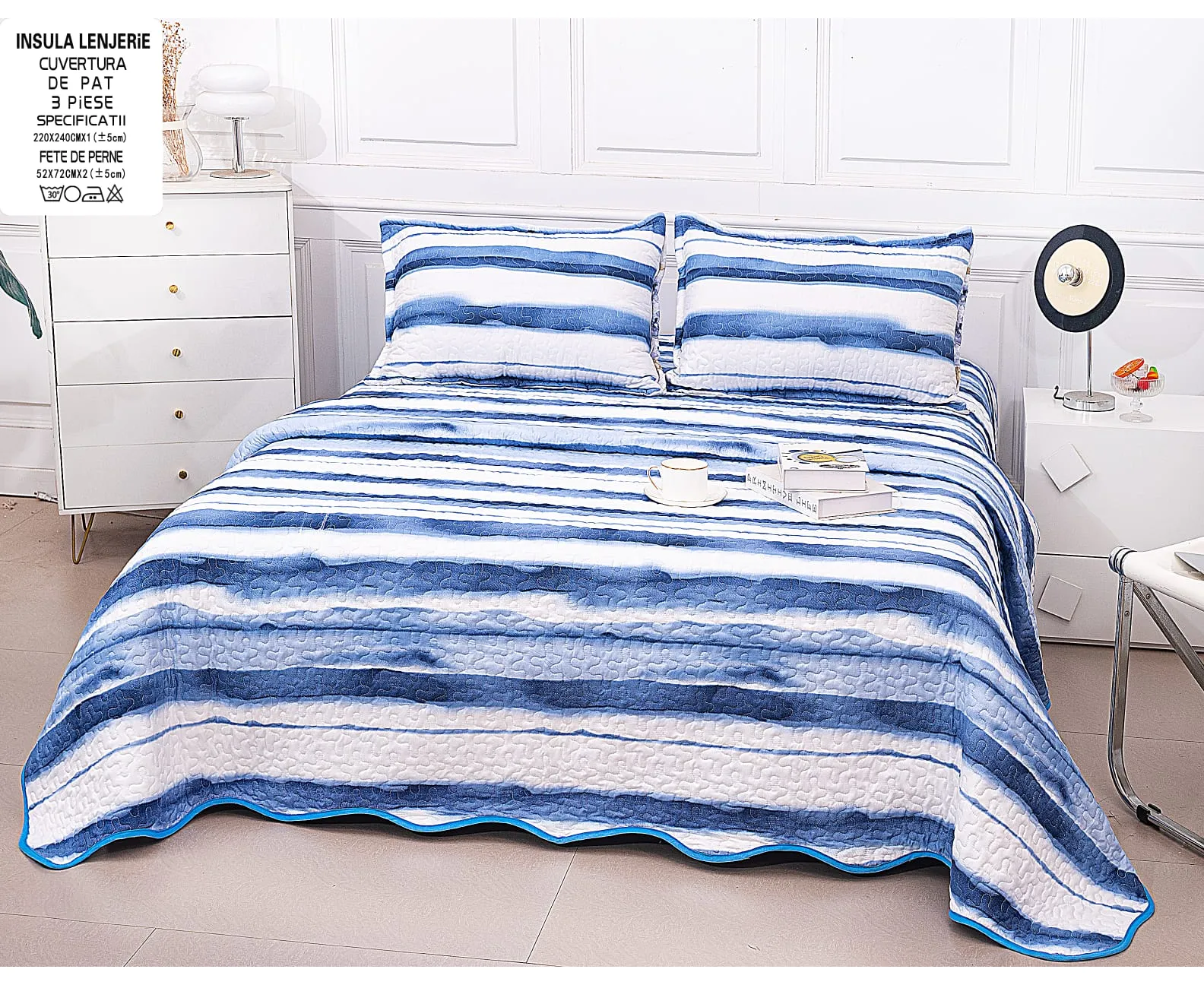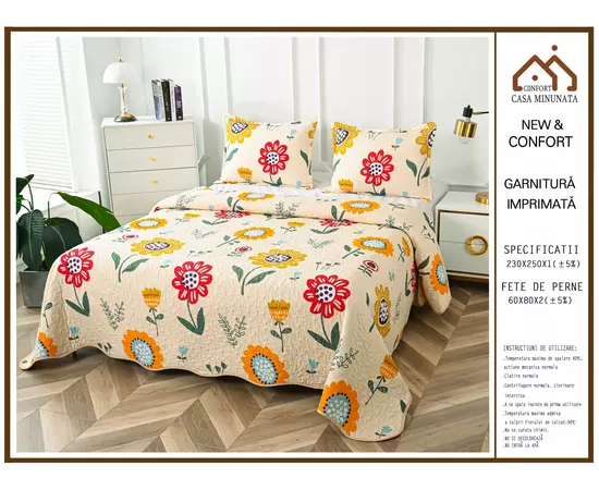 Cuvertura de pat matlasata, confectionata din bumbac tip tesatura finet.Imprimeul acestui set (cuvertura pat plus fete de perna) este realizat cu cele mai noi tehnologii - garantat nu se decoloreaza daca se respecta instructiunile de intretinere.