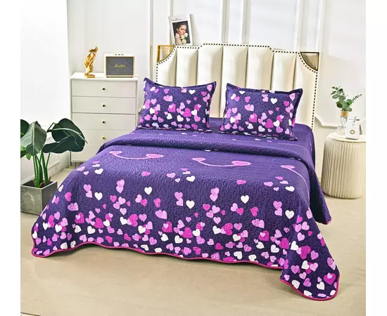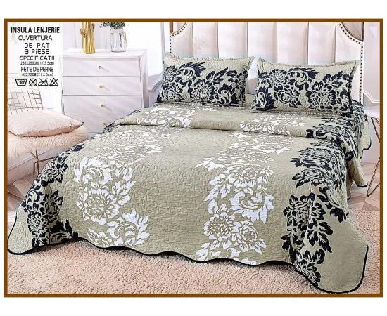 Cuvertura de pat matlasata, confectionata din bumbac tip tesatura finet.Imprimeul acestui set (cuvertura pat plus fete de perna) este realizat cu cele mai noi tehnologii - garantat nu se decoloreaza daca se respecta instructiunile de intretinere.