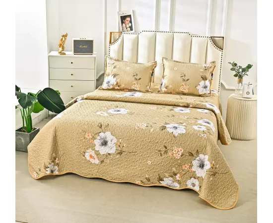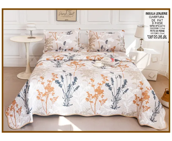Cuvertura de pat matlasata, confectionata din bumbac tip tesatura finet.Imprimeul acestui set (cuvertura pat plus fete de perna) este realizat cu cele mai noi tehnologii - garantat nu se decoloreaza daca se respecta instructiunile de intretinere.