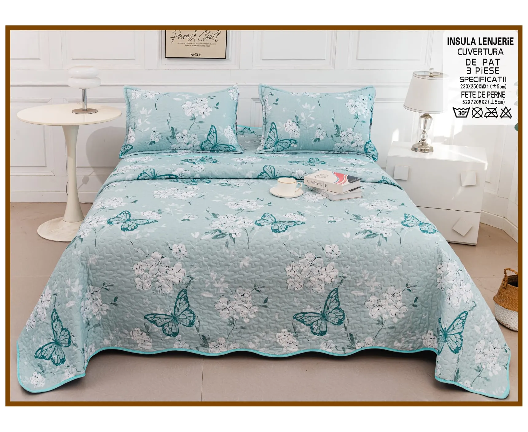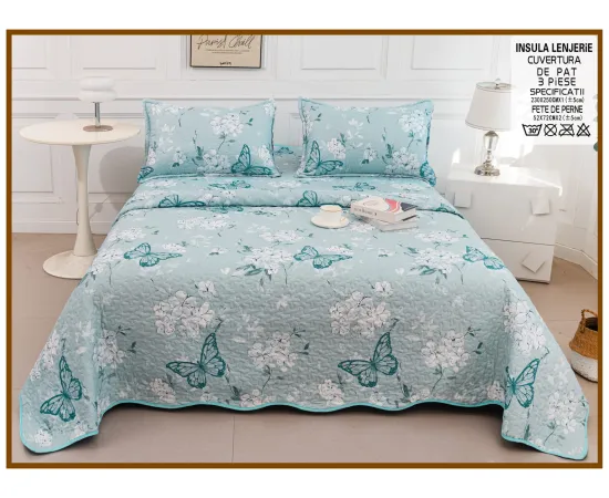 Cuvertura de pat matlasata, confectionata din bumbac tip tesatura finet.Imprimeul acestui set (cuvertura pat plus fete de perna) este realizat cu cele mai noi tehnologii - garantat nu se decoloreaza daca se respecta instructiunile de intretinere.