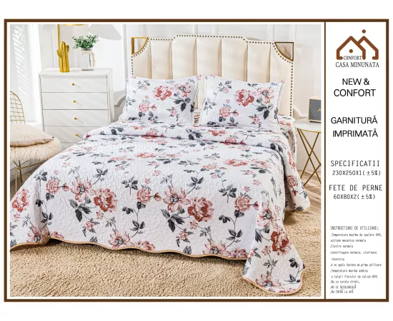 Cuvertura de pat matlasata, confectionata din bumbac tip tesatura finet.Imprimeul acestui set (cuvertura pat plus fete de perna) este realizat cu cele mai noi tehnologii - garantat nu se decoloreaza daca se respecta instructiunile de intretinere.