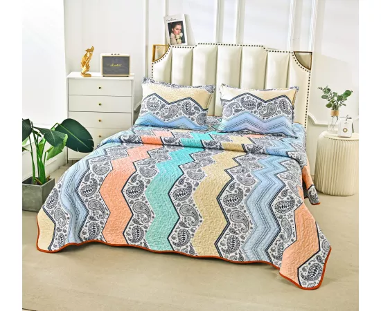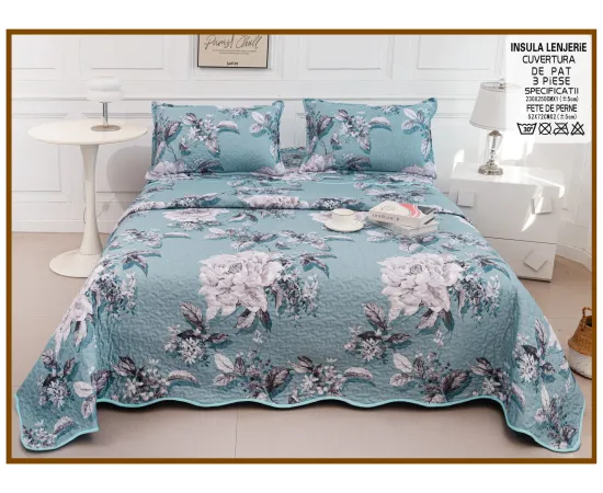 Cuvertura de pat matlasata, confectionata din bumbac tip tesatura finet.Imprimeul acestui set (cuvertura pat plus fete de perna) este realizat cu cele mai noi tehnologii - garantat nu se decoloreaza daca se respecta instructiunile de intretinere.