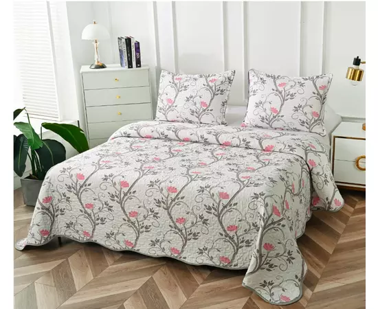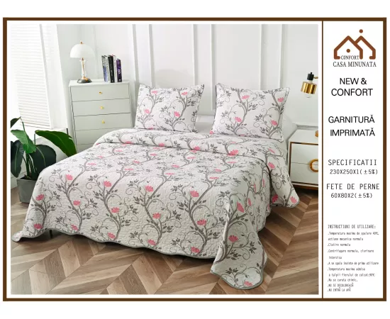Cuvertura de pat matlasata, confectionata din bumbac tip tesatura finet.Imprimeul acestui set (cuvertura pat plus fete de perna) este realizat cu cele mai noi tehnologii - garantat nu se decoloreaza daca se respecta instructiunile de intretinere.