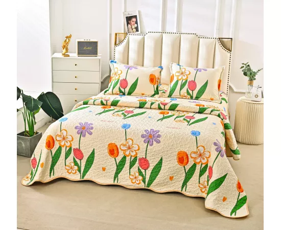 Cuvertura de pat matlasata, confectionata din bumbac tip tesatura finet.Imprimeul acestui set (cuvertura pat plus fete de perna) este realizat cu cele mai noi tehnologii - garantat nu se decoloreaza daca se respecta instructiunile de intretinere.