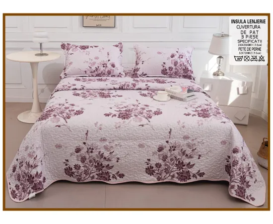 Cuvertura de pat matlasata, confectionata din bumbac tip tesatura finet.Imprimeul acestui set (cuvertura pat plus fete de perna) este realizat cu cele mai noi tehnologii - garantat nu se decoloreaza daca se respecta instructiunile de intretinere.
