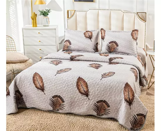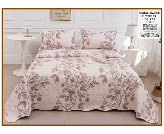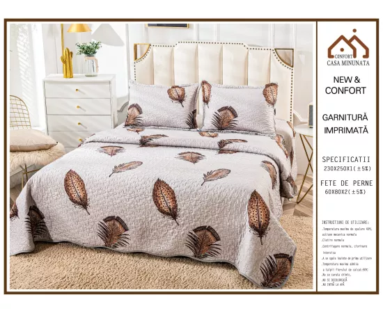 Cuvertura de pat matlasata, confectionata din bumbac tip tesatura finet.Imprimeul acestui set (cuvertura pat plus fete de perna) este realizat cu cele mai noi tehnologii - garantat nu se decoloreaza daca se respecta instructiunile de intretinere.