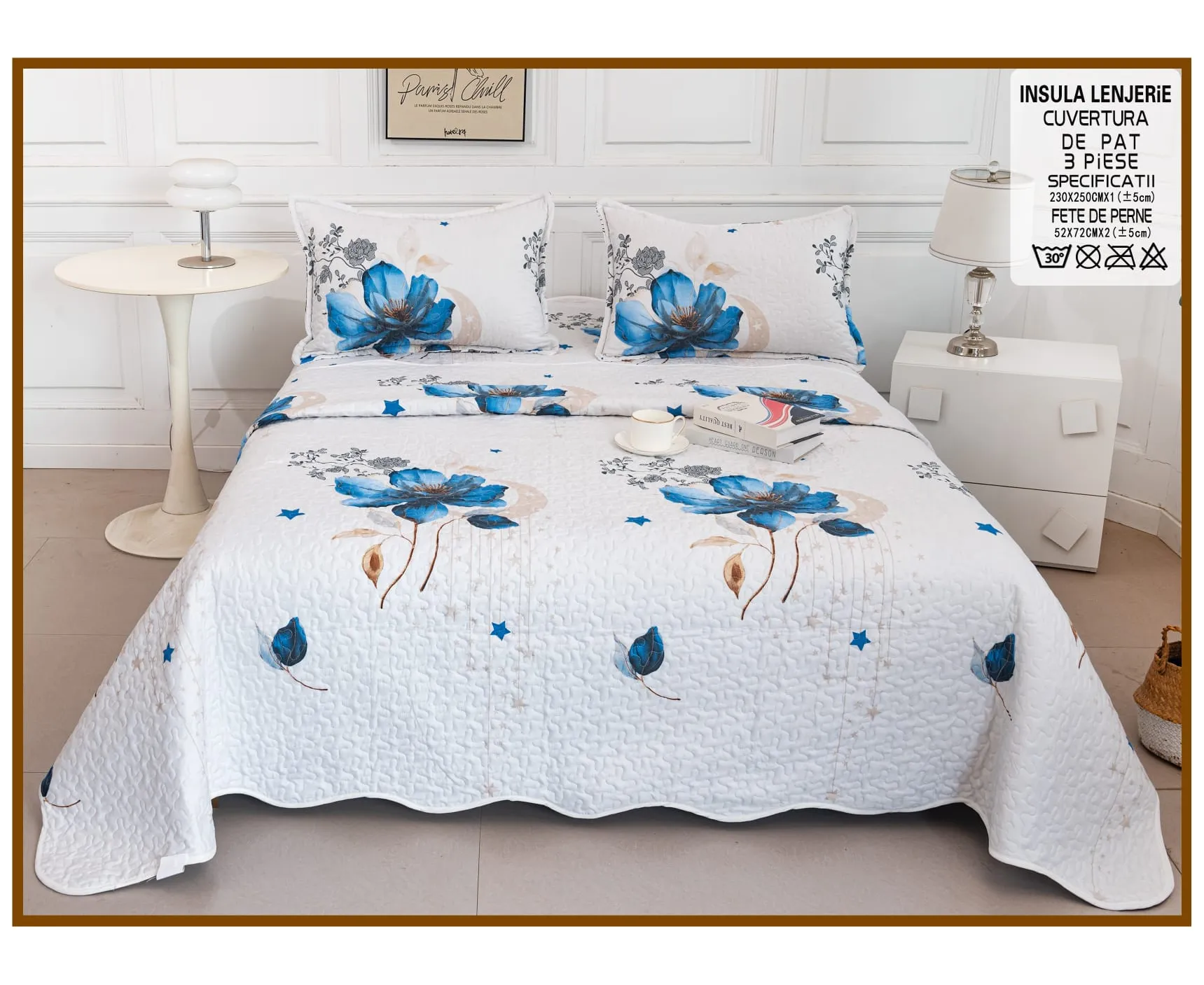 Cuvertura de pat matlasata, confectionata din bumbac tip tesatura finet.Imprimeul acestui set (cuvertura pat plus fete de perna) este realizat cu cele mai noi tehnologii - garantat nu se decoloreaza daca se respecta instructiunile de intretinere.