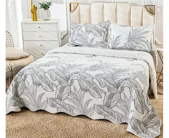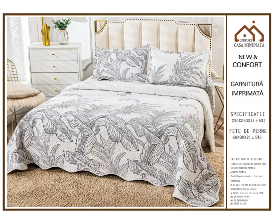 Cuvertura de pat matlasata, confectionata din bumbac tip tesatura finet.Imprimeul acestui set (cuvertura pat plus fete de perna) este realizat cu cele mai noi tehnologii - garantat nu se decoloreaza daca se respecta instructiunile de intretinere.