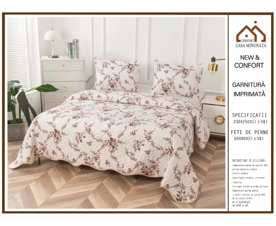 Cuvertura de pat matlasata, confectionata din bumbac tip tesatura finet.Imprimeul acestui set (cuvertura pat plus fete de perna) este realizat cu cele mai noi tehnologii - garantat nu se decoloreaza daca se respecta instructiunile de intretinere.