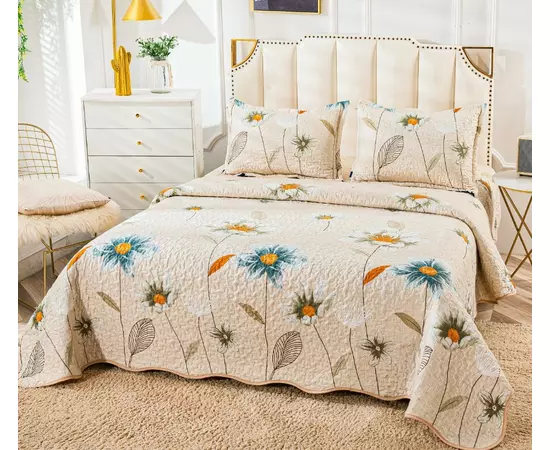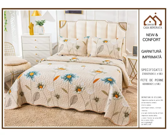 Cuvertura de pat matlasata, confectionata din bumbac tip tesatura finet.Imprimeul acestui set (cuvertura pat plus fete de perna) este realizat cu cele mai noi tehnologii - garantat nu se decoloreaza daca se respecta instructiunile de intretinere.