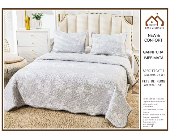 Cuvertura de pat matlasata, confectionata din bumbac tip tesatura finet.Imprimeul acestui set (cuvertura pat plus fete de perna) este realizat cu cele mai noi tehnologii - garantat nu se decoloreaza daca se respecta instructiunile de intretinere.