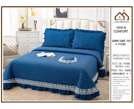 Cuvertura de pat matlasata, confectionata din bumbac tip tesatura finet.Imprimeul acestui set (cuvertura pat plus fete de perna) este realizat cu cele mai noi tehnologii - garantat nu se decoloreaza daca se respecta instructiunile de intretinere.