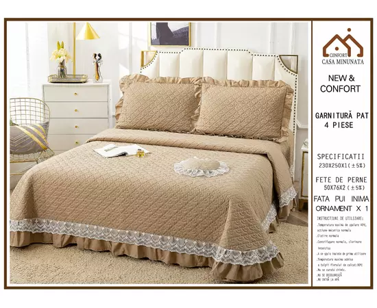 Cuvertura de pat matlasata, confectionata din bumbac tip tesatura finet.Imprimeul acestui set (cuvertura pat plus fete de perna) este realizat cu cele mai noi tehnologii - garantat nu se decoloreaza daca se respecta instructiunile de intretinere.