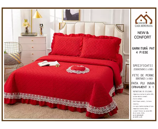 Set Cuvertura de Pat din Bumbac, 4 Piese, Rosu - PIT161